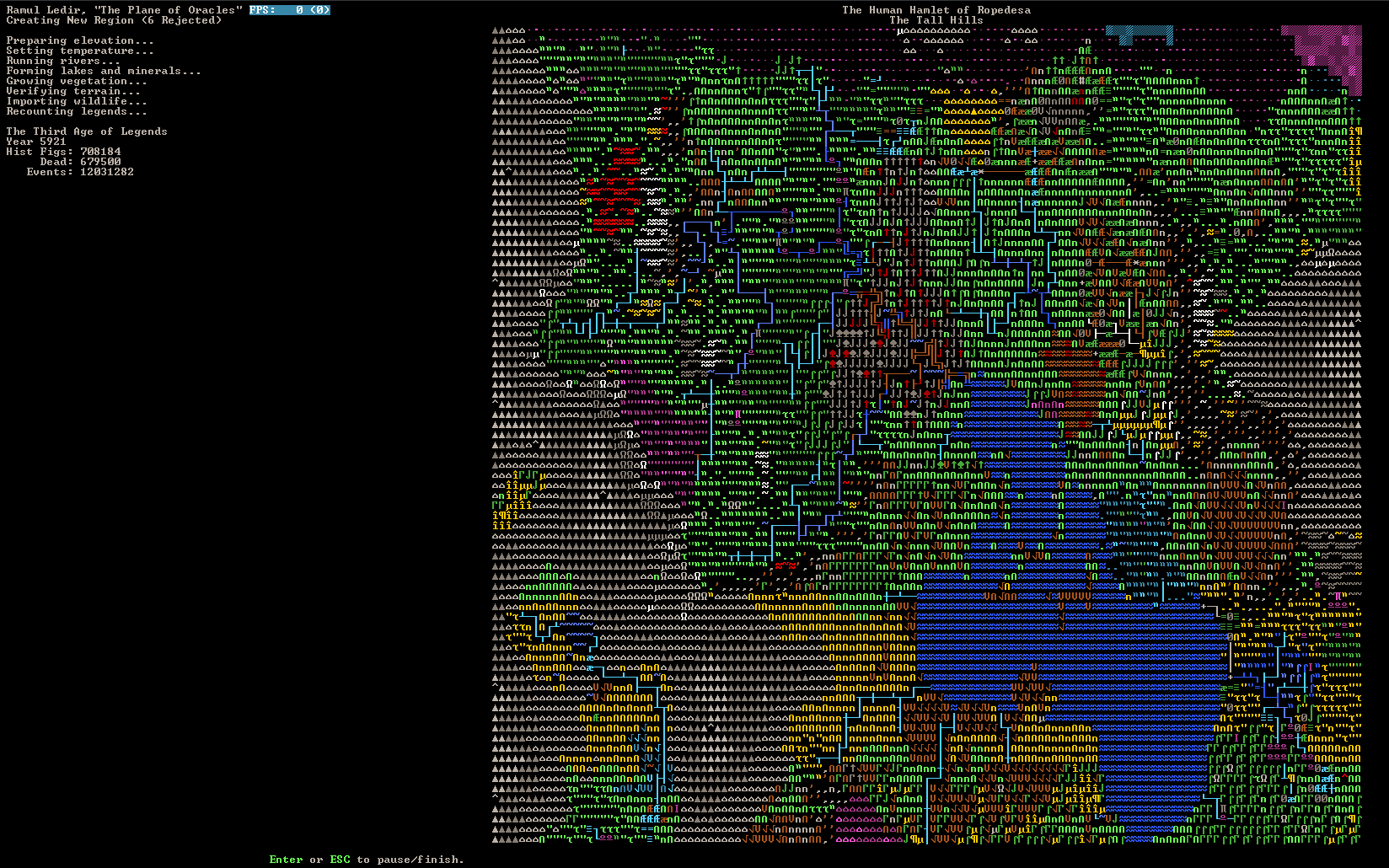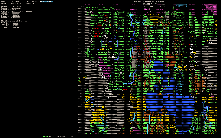 The first thing you need to do before you can actually play the game is to generate said random, persistent world. This step is highly detailed compared to your average randomly generated world, moving through several stages that build upon one another to create a world with a depth that rivals some of the most obsessively hand written works of fiction. Particular attention is paid to the inhabitants of the world, simulating their lives as they move around the world, fight great mythical beasts, steal valuable treasures, settle down and have a family, and ultimately die leaving a mark of some kind upon the world's history.